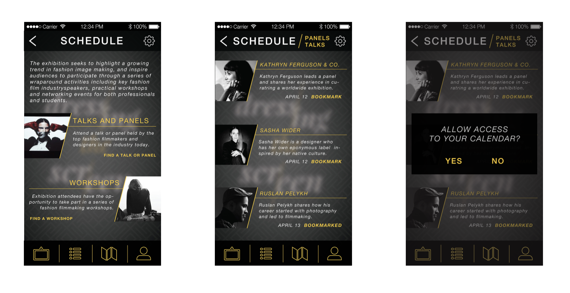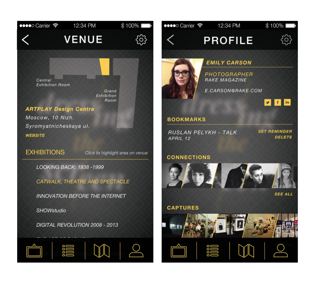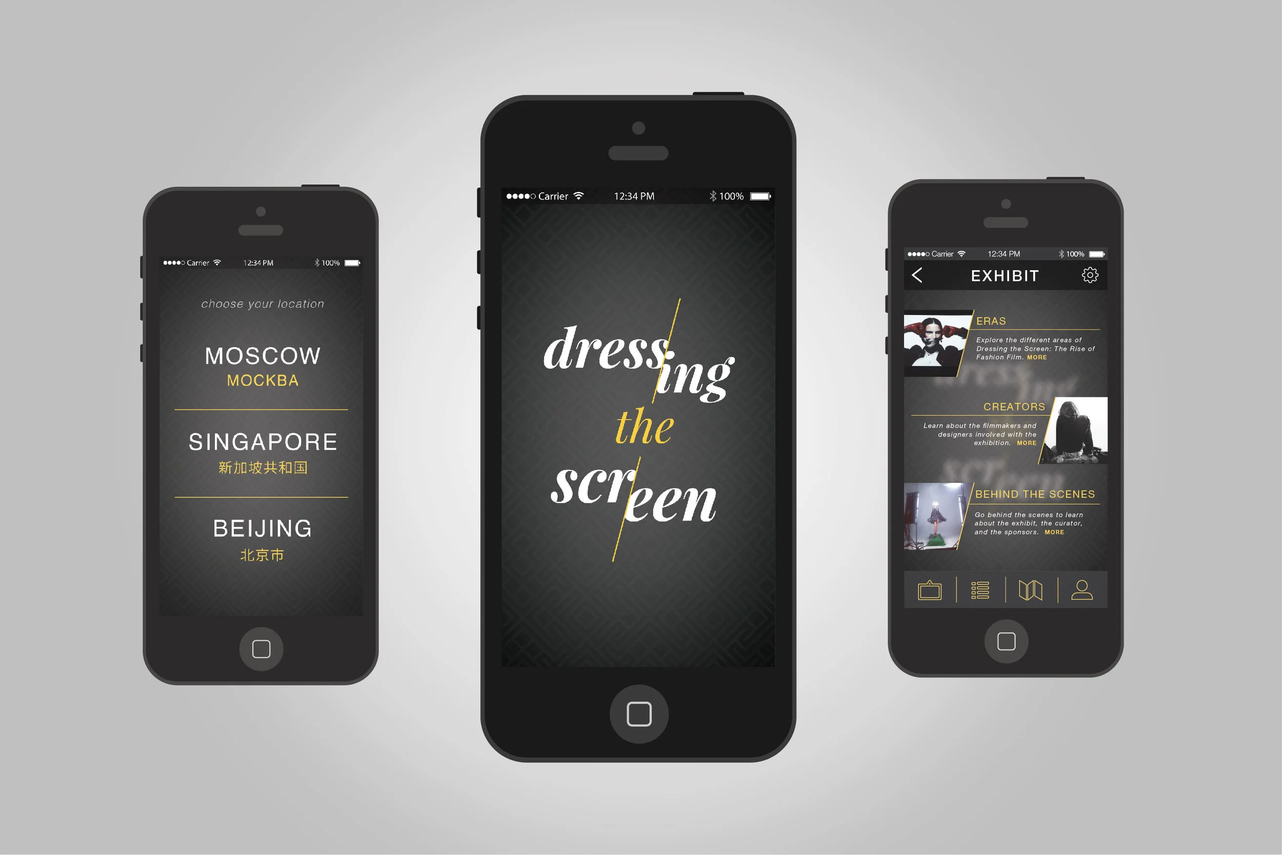 Dressing the Screen is an international exhibition hosted by British Council, showcasing the intersection between Fashion and Film. The exhibition is held in different international cities, including Moscow, Singapore, and Beijing. For the exhibition, I designed a bilingual mobile phone application that attendees may use to learn more information about the exhibit itself, as well as using it as a networking tool to stay in touch with other professionals they may meet and connect with.